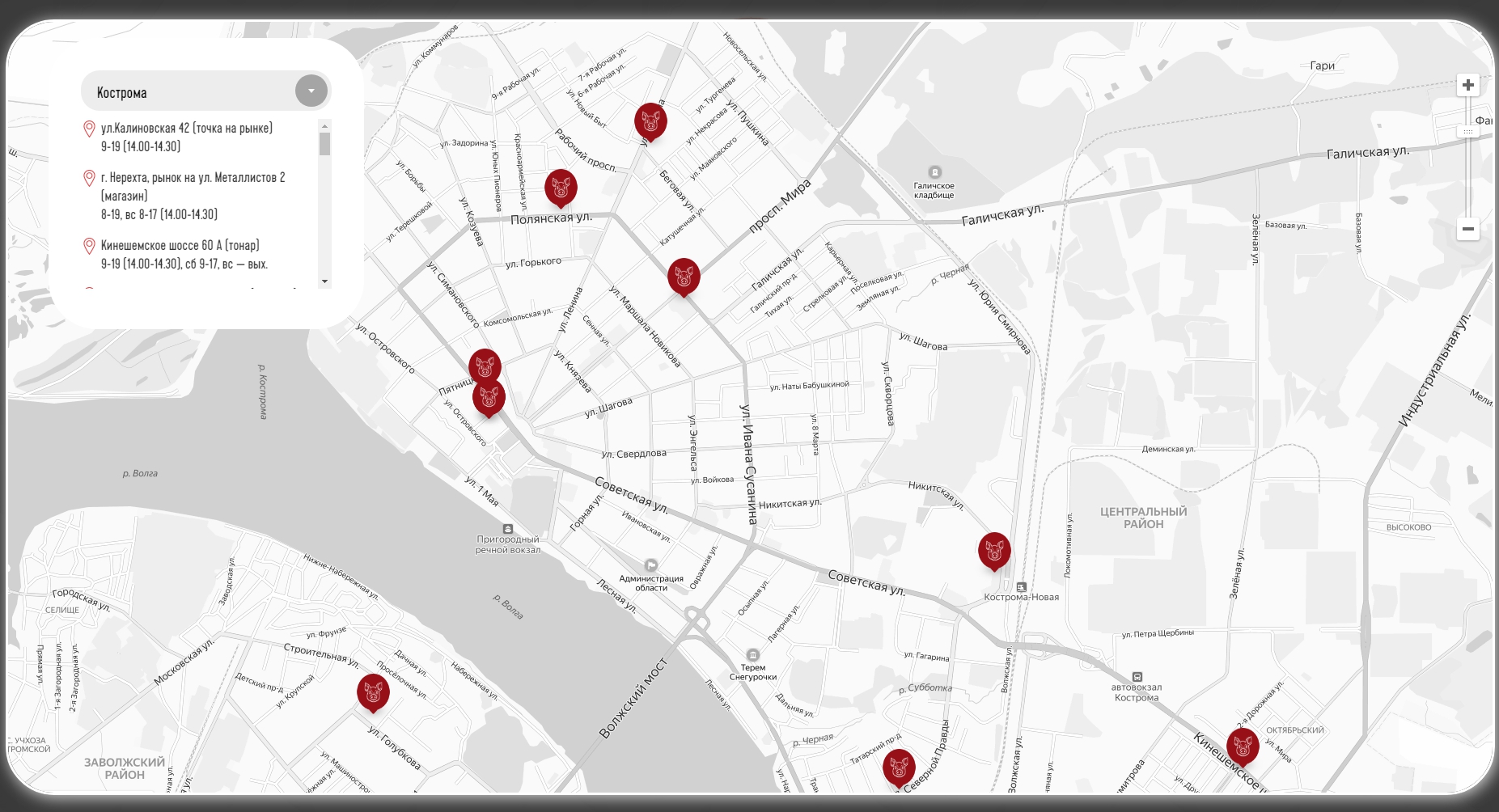 Также нами была реализована удобная карта с отметкой точек продажи продукции АО "Шувалово". На карте можно выбрать город, в котором интересуют точки продаж, и далее выбрать наиболее удобную для приобретения товаров. Выбор можно сделать как и на самой карте, так и в специальном окошке слева. Карта разворачивается на весь экран в поп-ап окне, масштабируется и перемещается во все стороны мышкой.