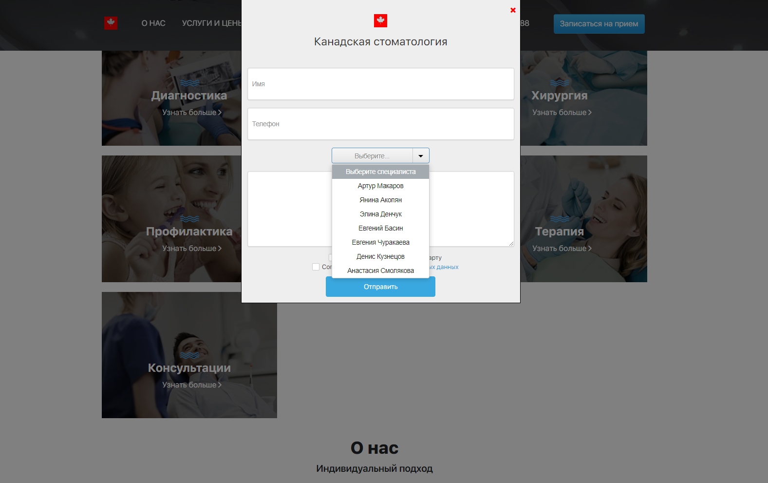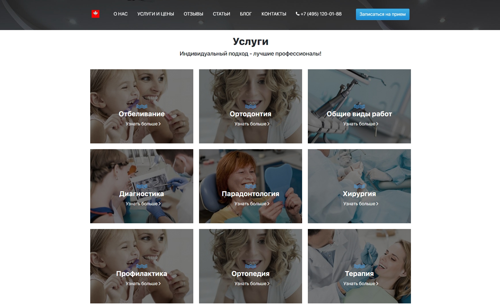 7. Продумана перелинковка и взаимосвязь между разделами сайта. При выборе конкретной услуги клиент стоматологии может сразу же посмотреть, какие врачи ее оказывают и записаться на прием к своему стоматологу. Превью карточек врачей подгружаются из раздела "Команда".